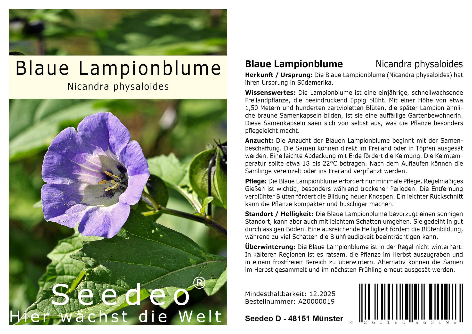 Wissenswertes: Die Lampionblume ist eine einjährige, schnellwachsende und üppig blühende Freilandpflanze. Sie erreicht eine Höhe von etwa 1,50 Metern. Nach 6 bis 8 Wochen setzt sie hunderte zartviolette Blüten an, aus denen sich später lampionähnliche schwarze Samenkapseln bilden. Diese Samenkapseln säen sich von selbst wieder aus. Die Pflanze ist ausgesprochen pflegeleicht.