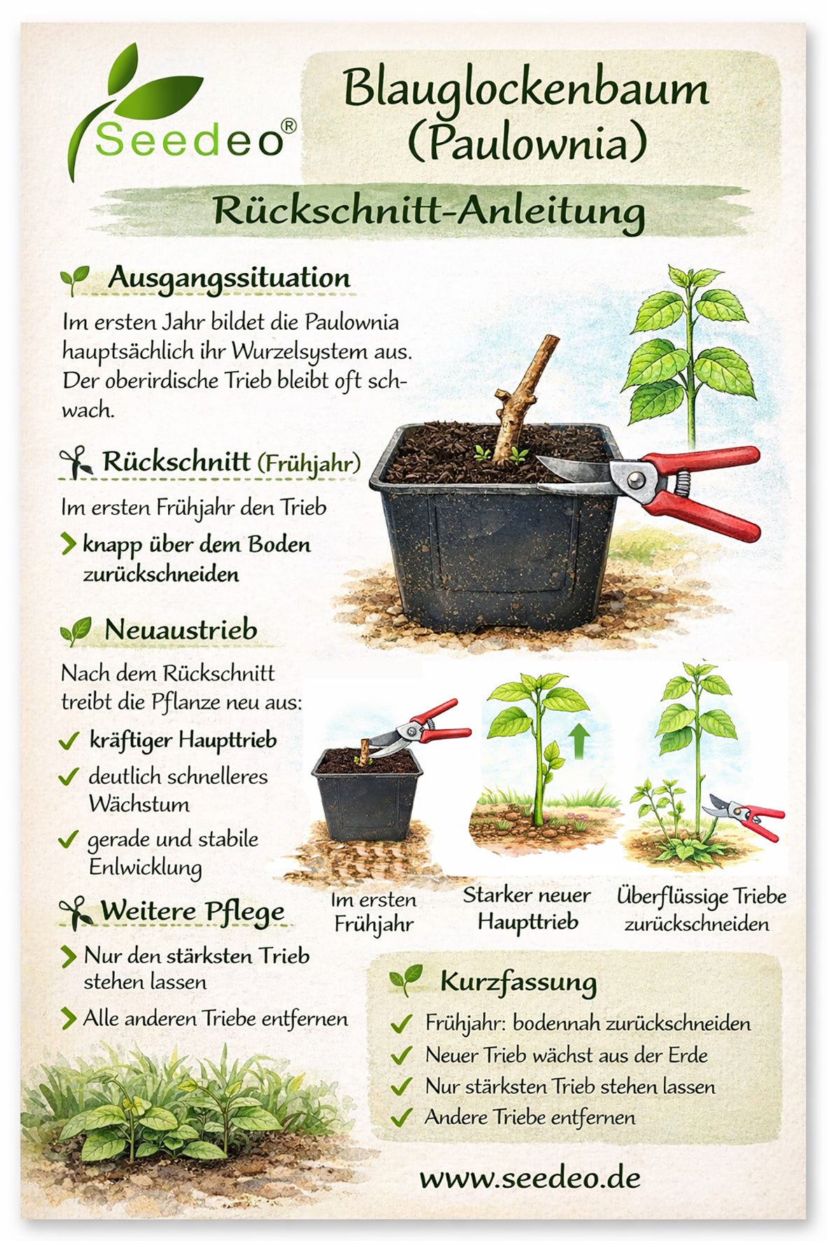 Rückschnitt: Die Paulownia bildet im ersten Jahr hauptsächlich ein starkes Wurzelwerk aus. Dabei wird die Ausbildung des Haupttriebes etwas vernachlässigt. Für die bestmögliche Entwicklung der Pflanze ist es ratsam, den Paulownia-Trieb im zweiten Jahr zurückzuschneiden.Schneiden Sie die Paulownia vor Beginn des zweiten Wuchsjahres komplett bis zur Erdoberfläche zurück (hinter dem letzten Auge). Der neue Trieb wächst direkt aus dem Wurzelstock aus und bekommt dann einen Wuchs von ca. 1,5 – 2 Meter.