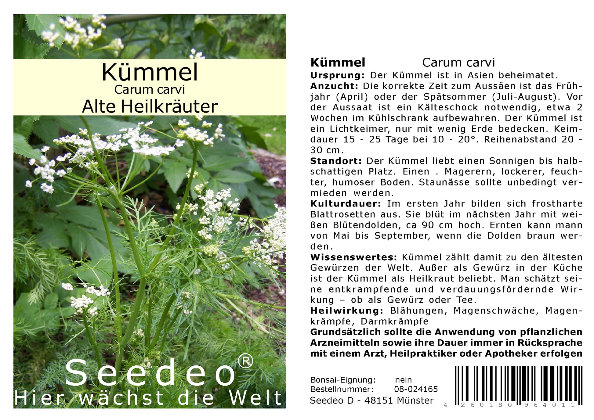 Anzucht: Für eine erfolgreiche Aussaat sollte Kümmel im Frühjahr (April) oder im Spätsommer (Juli-August) gesät werden. Ein vorheriger Kälteschock, durch eine Lagerung von etwa zwei Wochen im Kühlschrank, fördert die Keimung. Kümmel benötigt als Lichtkeimer nur eine leichte Abdeckung mit Erde. Die Keimdauer liegt zwischen 15 und 25 Tagen bei einer Temperatur von 10 bis 20°C. Ein Reihenabstand von 20 bis 30 cm ist ideal.