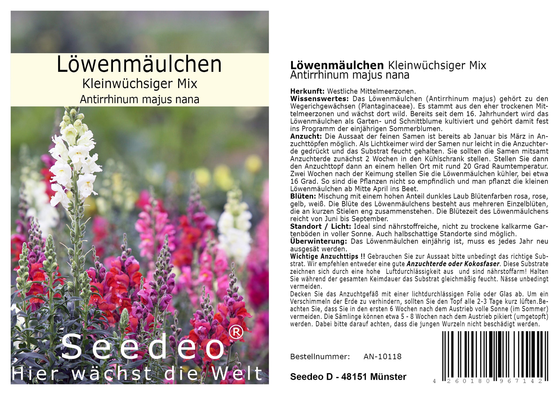 Wissenswertes: Das Löwenmäulchen (Antirrhinum majus) gehört zur Familie der Wegerichgewächse (Plantaginaceae). Ursprünglich aus den trockeneren Regionen des westlichen Mittelmeers stammend, wächst es dort wild. Seit dem 16. Jahrhundert wird das Löwenmäulchen als beliebte Garten- und Schnittblume kultiviert und ist ein fester Bestandteil im Sortiment der einjährigen Sommerblumen.