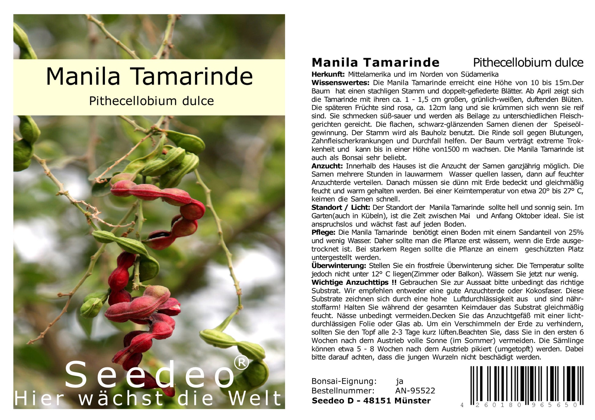 Wissenswertes: Die Manila Tamarinde erreicht eine Höhe von 10 bis 15 Metern. Der Baum hat einen stacheligen Stamm und doppelt gefiederte Blätter. Ab April zeigt sich die Tamarinde mit ihren etwa 1 bis 1,5 cm großen, grünlich-weißen, duftenden Blüten. Die späteren Früchte sind rosa, etwa 12 cm lang und krümmen sich, wenn sie reif sind. Sie schmecken süß-sauer und werden als Beilage zu verschiedenen Fleischgerichten gereicht. Die flachen, schwarz-glänzenden Samen werden zur Speiseölgewinnung genutzt. Der Stamm wird als Bauholz verwendet. Die Rinde soll gegen Blutungen, Zahnfleischerkrankungen und Durchfall helfen. Der Baum verträgt extreme Trockenheit und kann in Höhenlagen bis zu 1500 Metern wachsen. Die Manila Tamarinde ist auch als Bonsai sehr beliebt.