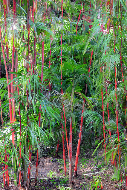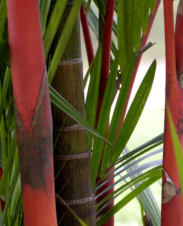 Wissenswertes: Die Rotstielpalme ist besonders auffällig durch ihre leuchtend roten, schmalen Mehrfachstämme und die ebenfalls roten Blattstiele ihrer Fiederblätter.
