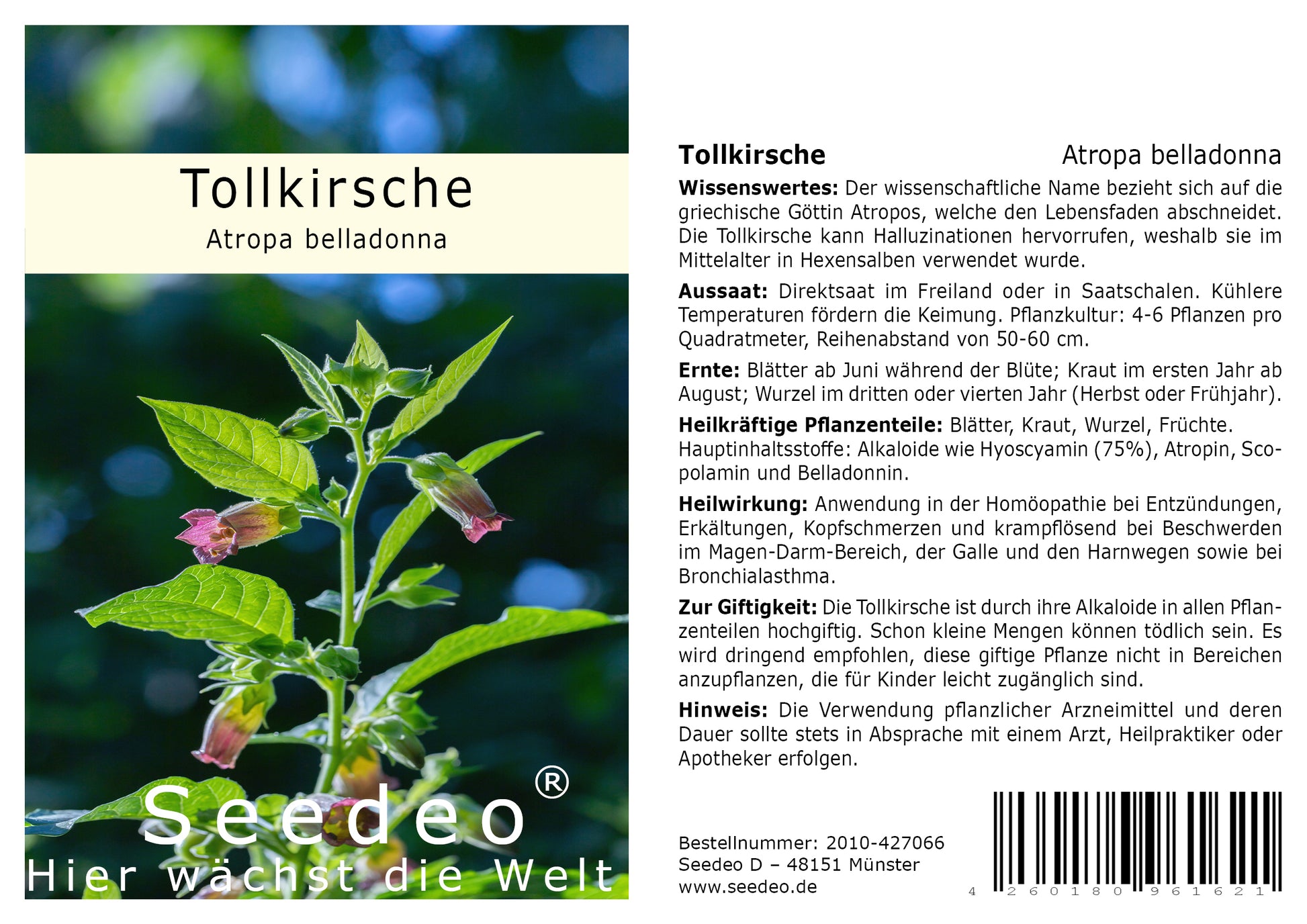Zur Giftigkeit: Die Tollkirsche ist durch ihre Alkaloide in allen Pflanzenteilen hochgiftig. Schon kleine Mengen können tödlich sein. Es wird dringend empfohlen, diese giftige Pflanze nicht in Bereichen anzupflanzen, die für Kinder leicht zugänglich sind.