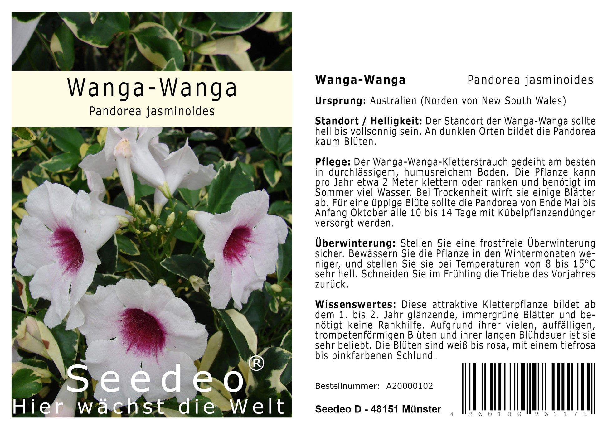 Pflege: Der Wanga-Wanga-Kletterstrauch gedeiht am besten in durchlässigem, humusreichem Boden. Die Pflanze kann pro Jahr etwa 2 Meter klettern oder ranken und benötigt im Sommer viel Wasser. Bei Trockenheit wirft sie einige Blätter ab. Für eine üppige Blüte sollte die Pandorea von Ende Mai bis Anfang Oktober alle 10 bis 14 Tage mit Kübelpflanzendünger versorgt werden.