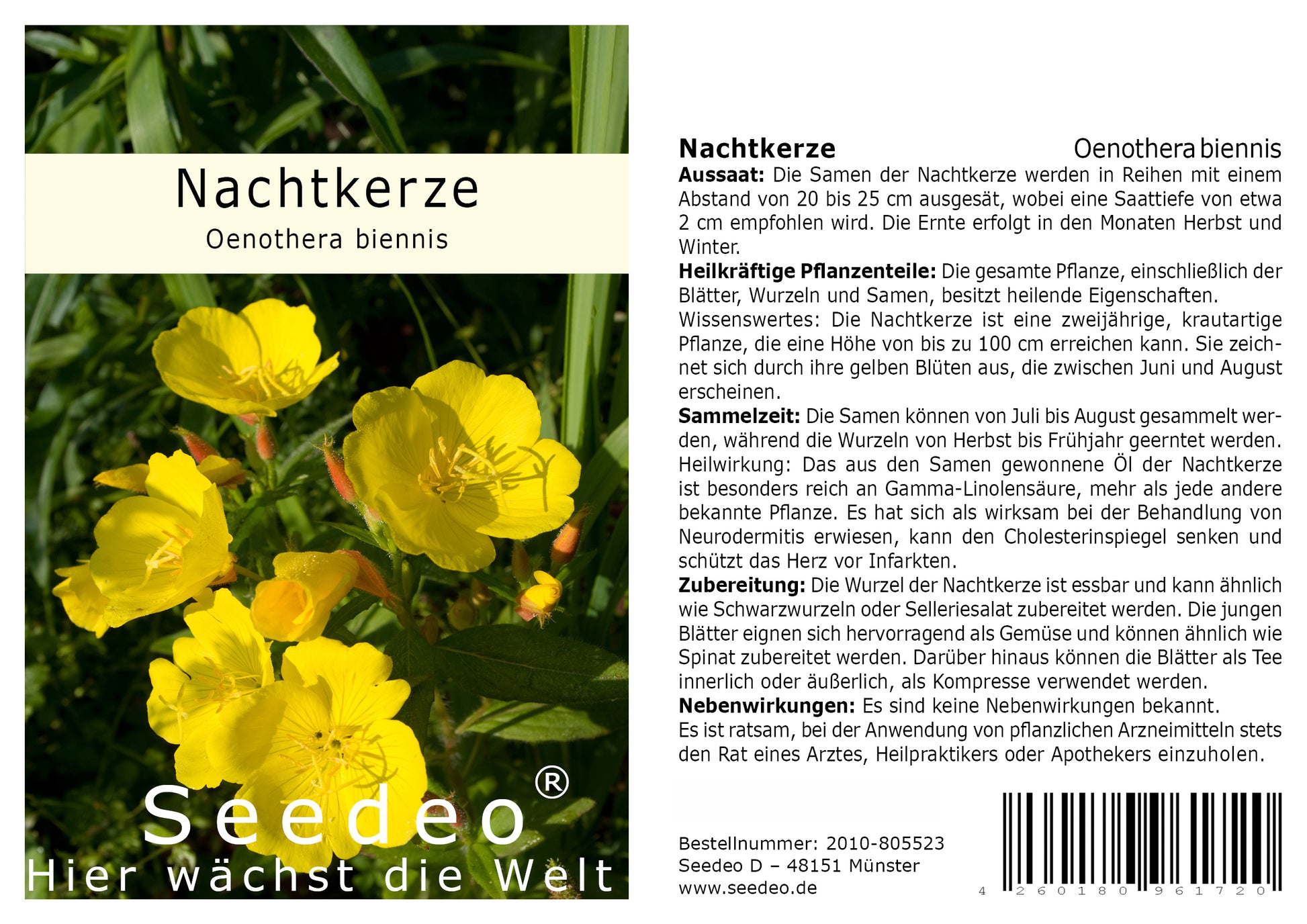 Aussaat: Die Samen der Nachtkerze werden in Reihen mit einem Abstand von 20 bis 25 cm ausgesät, wobei eine Saattiefe von etwa 2 cm empfohlen wird. Die Ernte erfolgt in den Monaten Herbst und Winter.