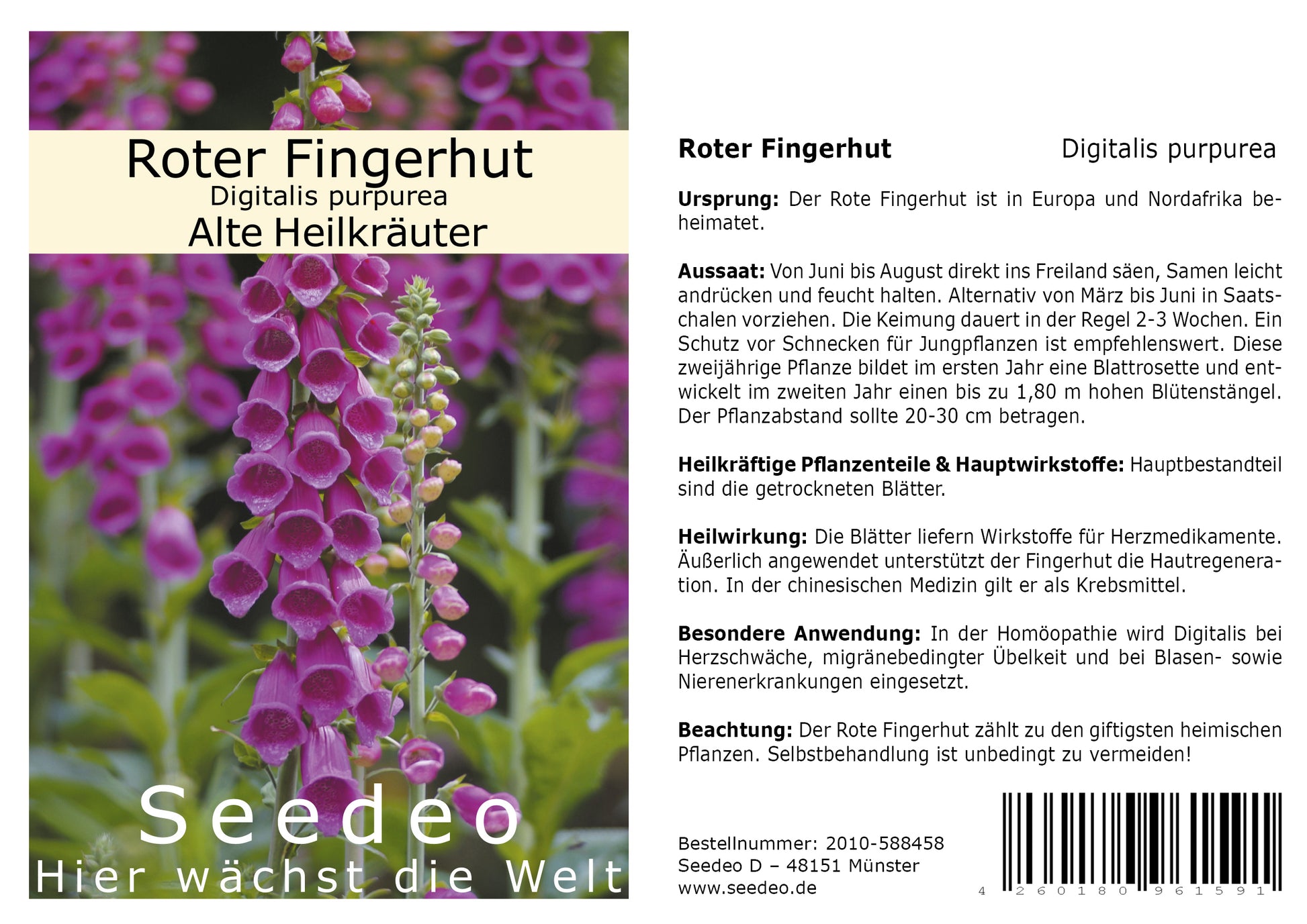 Ursprung: Der Rote Fingerhut ist in Europa und Nordafrika beheimatet.Aussaat: Von Juni bis August direkt ins Freiland säen, Samen leicht andrücken und feucht halten. Alternativ von März bis Juni in Saatschalen vorziehen. Die Keimung dauert in der Regel 2-3 Wochen. Ein Schutz vor Schnecken für Jungpflanzen ist empfehlenswert. Diese zweijährige Pflanze bildet im ersten Jahr eine Blattrosette und entwickelt im zweiten Jahr einen bis zu 1,80 m hohen Blütenstängel. Der Pflanzabstand sollte 20-30 cm betragen.